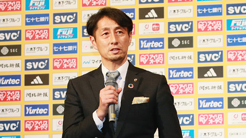 みなさんあけましておめでとうございます。今シーズンはここにいる選手たちとともに、2023年J2優勝、J1昇格を目指してがんばりたいと思います。心強い選手たちが入ってきたと思っています。みなさんとともに一緒に戦ってJ2優勝、J1昇格を勝ち取りましょう。よろしくお願いします。