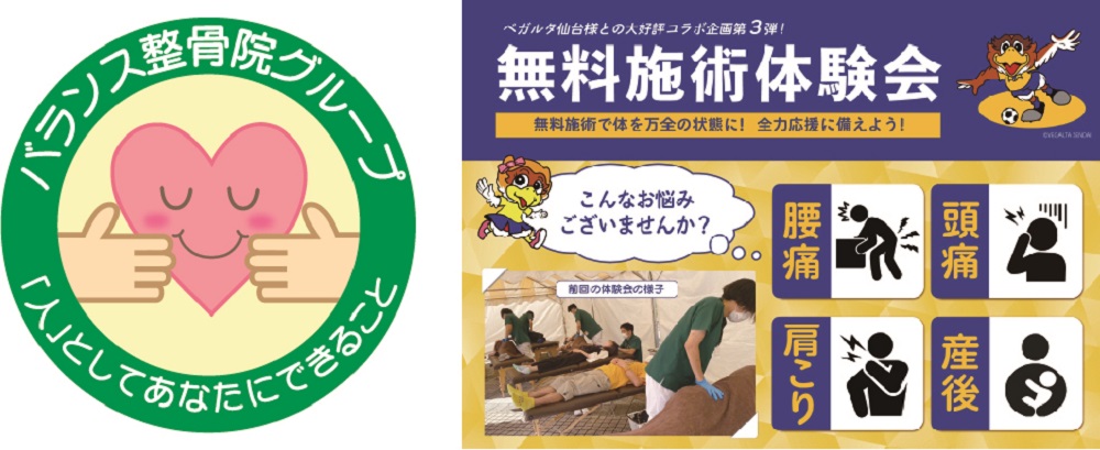 ベガルタ仙台のシルバースポンサーである「バランス整骨院グループ」様が南仙台バランス整骨院にてパーソナルトレーニングジムをオープンいたしました。これを記念し、6月11日(日)開催の2023明治安田生命J2リーグ 第20節 ジュビロ磐田戦において「無料施術体験会」を実施いたします。