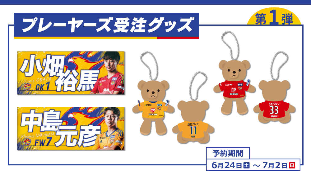 プレーヤーズ受注グッズ第1弾となる今回は、昨年大好評の「プレイヤーズフェイスタオル」、ユニフォーム姿がかわいいボールチェーン付きの「プレーヤーズベアキーチェーン」の2種類をご用意いたしました。全選手対応商品なのでお好きな選手を選んで購入いただけます!