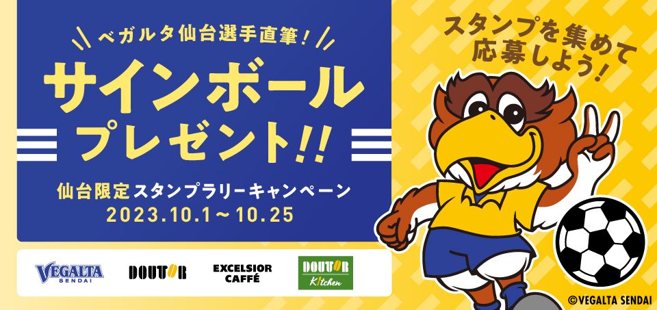 仙台市内にあるドトールコーヒーショップ、エクセルシオール カフェ、ドトールキッチンの各対象店舗にて、10月1日~10月25日までスタンプラリーキャンペーンを実施します。各対象店舗内に提示しているキャンペーンPOPの二次元コードを読み込んでマイページにログインし、スタンプを貯めて応募すると抽選でベガルタ仙台選手直筆サイン入りグッズをプレゼントいたします。ぜひこの機会に対象店舗をご利用ください。