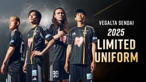 クラブ名の由来であり仙台の夏の風物詩である「仙台七夕」を夜空にきらめく天の川を胸元に走る黄金の一本線で象徴的に表現しました。その一筋の光に、悲願のJ1昇格へ向けて、ベガルタ仙台に関わるすべての方々が「ひとつ」になる想いも込めた、特別なユニフォーム。
