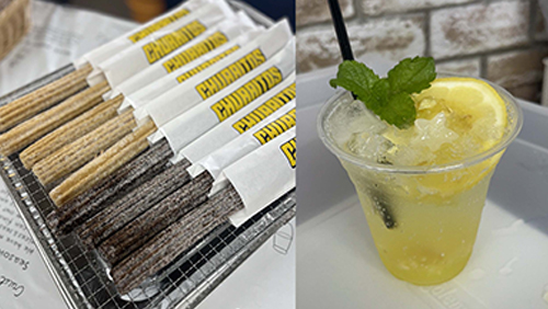 ロングチュリトスは専用オーブンで焼いているからサクサクもちもち。また、レモネードソーダははちみつとレモンの酸味に濃厚レモンジュレ入り爽やかドリンク。