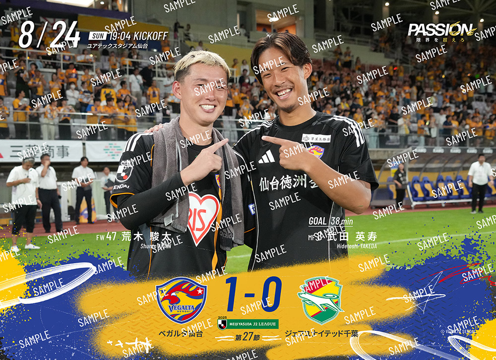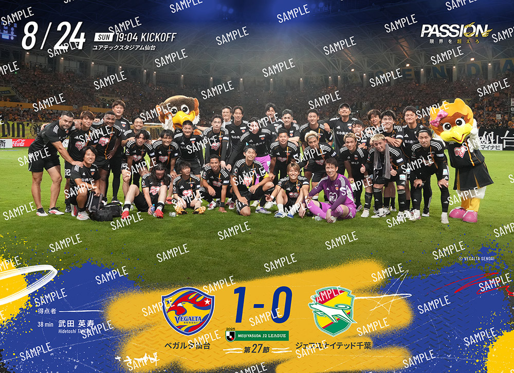 8月24日(日)開催、明治安田J2リーグ 第27節 ジェフユナイテッド千葉戦のブロマイドはただいまより購入可能です。ホームゲームにご来場いただき楽しんだ方も、DAZNで観戦いただいた方も、集めて楽しめる商品となります。ぜひ、2025シーズンのベガルタ仙台 勝利時のホームゲームブロマイドをご購入ください。