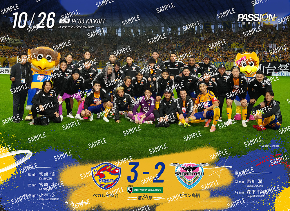 10月26日(日)開催、明治安田J2リーグ 第34節 サガン鳥栖戦のブロマイドはただいまより購入可能です。ホームゲームにご来場いただき楽しんだ方も、DAZNで観戦いただいた方も、集めて楽しめる商品となります。ぜひ、2025シーズンのベガルタ仙台 勝利時のホームゲームブロマイドをご購入ください。