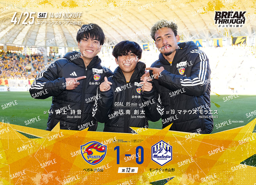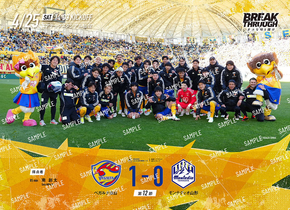 4月25日(土)開催、明治安田J2・J3百年構想リーグ 第12節モンテディオ山形戦のブロマイドはただいまより購入可能です。ホームゲームにご来場いただき楽しんだ方も、DAZNで観戦いただいた方も、集めて楽しめる商品となります。ぜひ、百年構想リーグのベガルタ仙台 勝利時のホームゲームブロマイドをご購入ください。また、ベガルタ仙台ではセブンプリントではほかにもシリーズを展開しています。ぜひご覧ください。