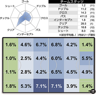 | 9 | 鳥栖 | 34(24) | 9 | 7 | 8 | 1 |