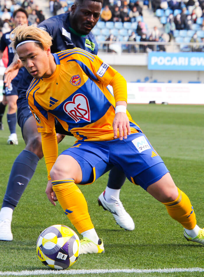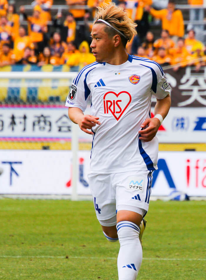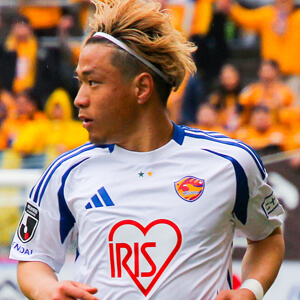 ベガルタ仙台加入3年目、MF14相良竜之介はすっかりこのチームの顔の1人だ。2023年に期限付き移籍で鳥栖から加わり、翌2024年には完全移籍。足技を駆使するドリブルで相手をかわし、味方のために攻撃の時間を作る。さらに左右両足のシュート力が高く、遠目の位置からでも積極的にゴールを狙う。昨シーズンは自己最多記録を更新する9ゴールを決めており、決勝ゴールになったものも少なくない。チームのJ1昇格プレーオフ進出に大きく貢献した一方で、決勝戦で敗れたときには仲間とともに大きな悔しさを味わった。