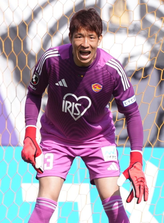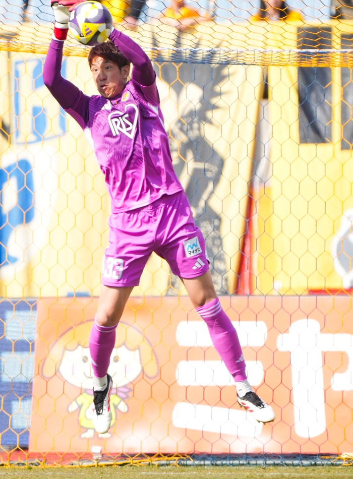 堅陣の最後尾に、GK33林彰洋の姿あり。前節・秋田戦では思うようにチームが攻撃のかたちを作ることができず、攻めに出てもボールを取られ、放りこまれ、押し戻される場面が連続した。その中でもDF陣とともに相手のハイボールを跳ね返し、味方を適確に動かすコーチングでも貢献。林のプレーが何度となくチームを助けた。後半立ち上がりの49分に相手FWが至近距離から放ったシュートをセーブするなど、素早い反応で壁となる体勢を作って相手の攻撃を食い止める。キャッチングとパンチングの判断も的確で、相手が繰り出すロングボールを決定機につなげさせなかった。